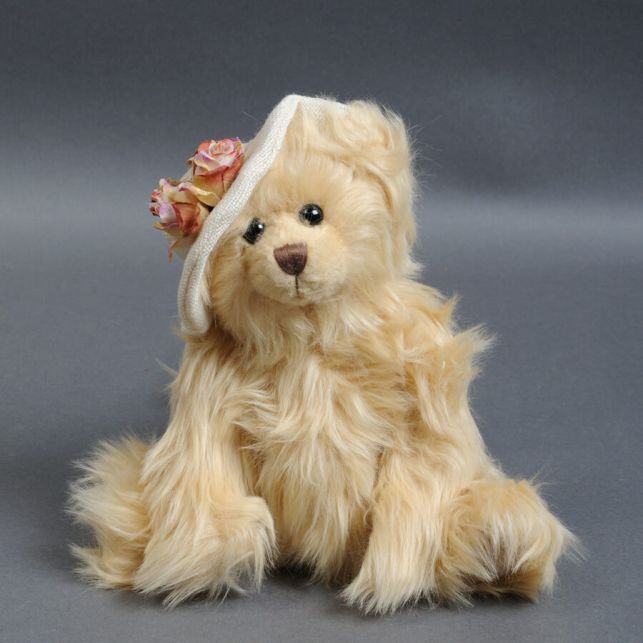 Toy in the form of a sitting bear in a hat. The height of the toy is 25 cm.