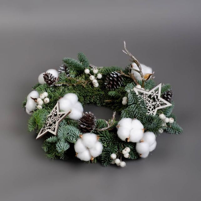 В состав композиции входят елка, елочные игрушки, фигурки птиц.
