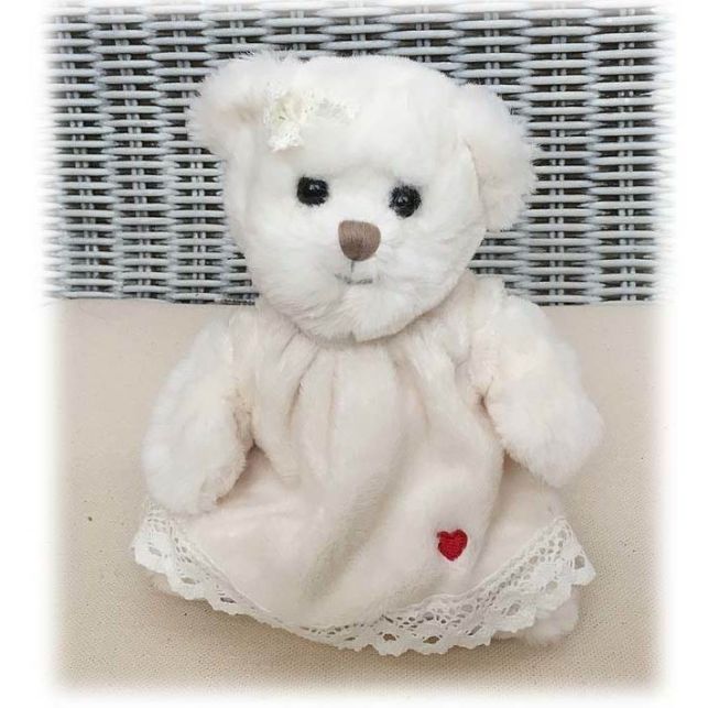 Маленький ведмедик-дівчинка білого кольору у ніжній плюшевій сукні з вишитим сердцем, 15 см